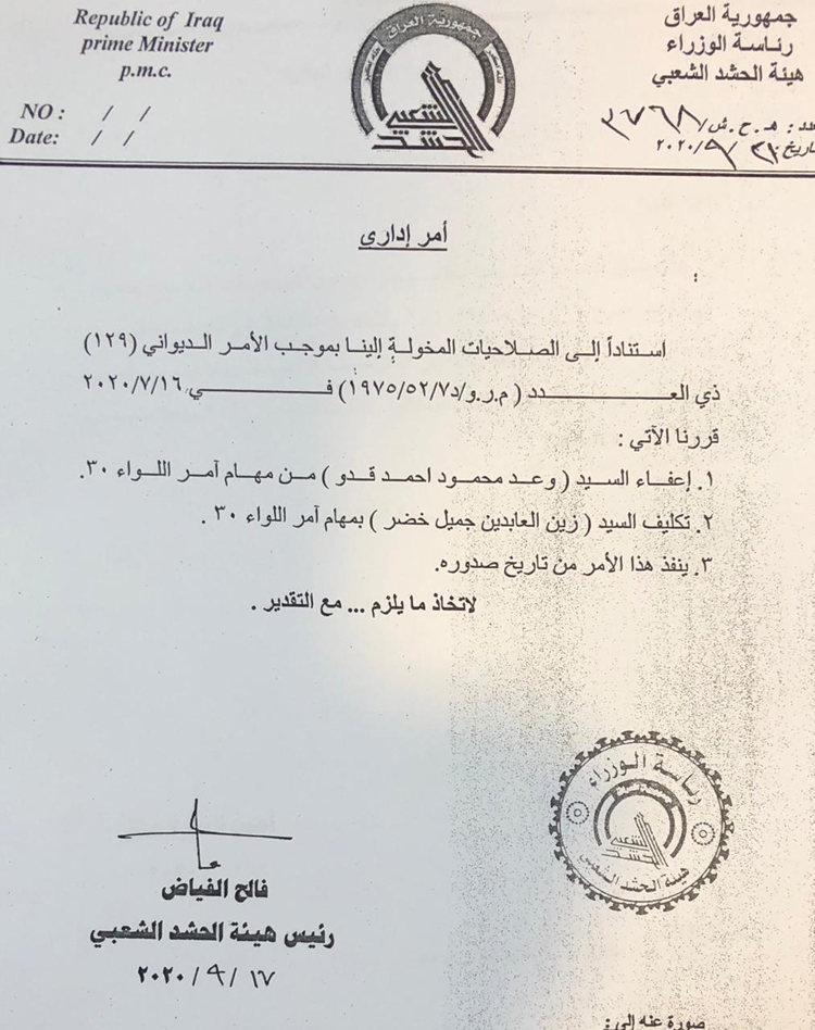 وثائق إعفاء حامد الجزائري ووعد قدو من منصبيهما في قيادة الحشد الشعبي
